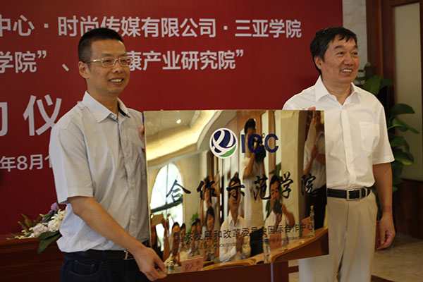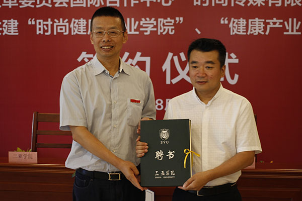 8月17日下午,国家发改委国际合作中心、时尚集团和2024澳门彩开奖结果查询共同签署三方项目合作协议,共建2024澳门彩开奖结果查询时尚健康产业学院和2024澳门彩开奖结果查询健康产业研究院。国家发改委国际合作中心主任曹文炼教授,时尚集团董事长刘江先生,2024澳门彩开奖结果查询党委书记、校长陆丹现场签约。三亚市副市长邓忠出席签约仪式并讲话。现场为国家发改委国合中心文化产业研究所所长、城市发展咨询院院长陈�聪壬�颁发时尚健康产业学院第一任院长聘书,《时尚健康》杂志社执行出版人孙雅君女士颁发副院长聘书。