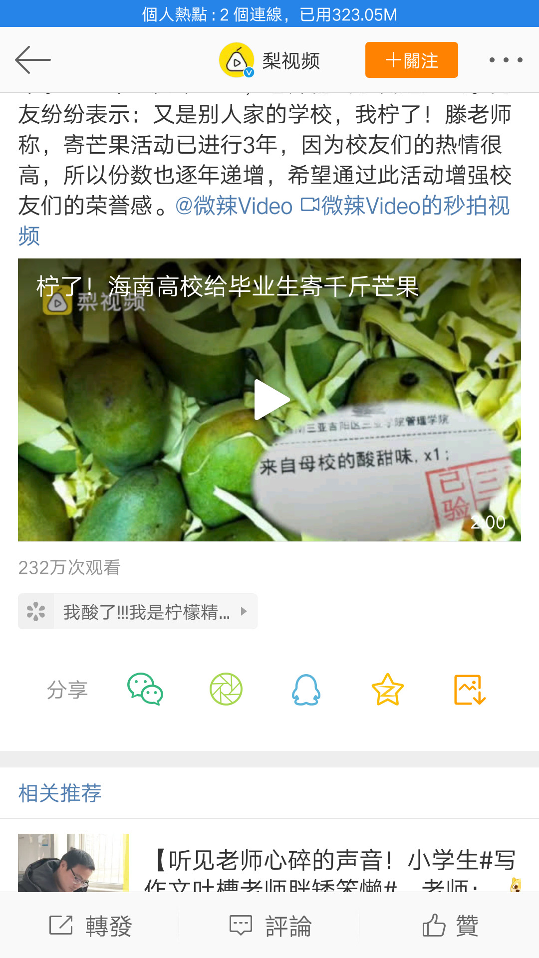 微博热门话题#高校给毕业校友寄1000斤芒果#阅读9262.9万,微博热搜榜第19位。