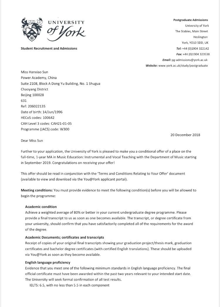 经过仔细考虑后,今年,我将入学英国约克大学音乐学院,成为音乐教育(钢琴方向)专业研究生。