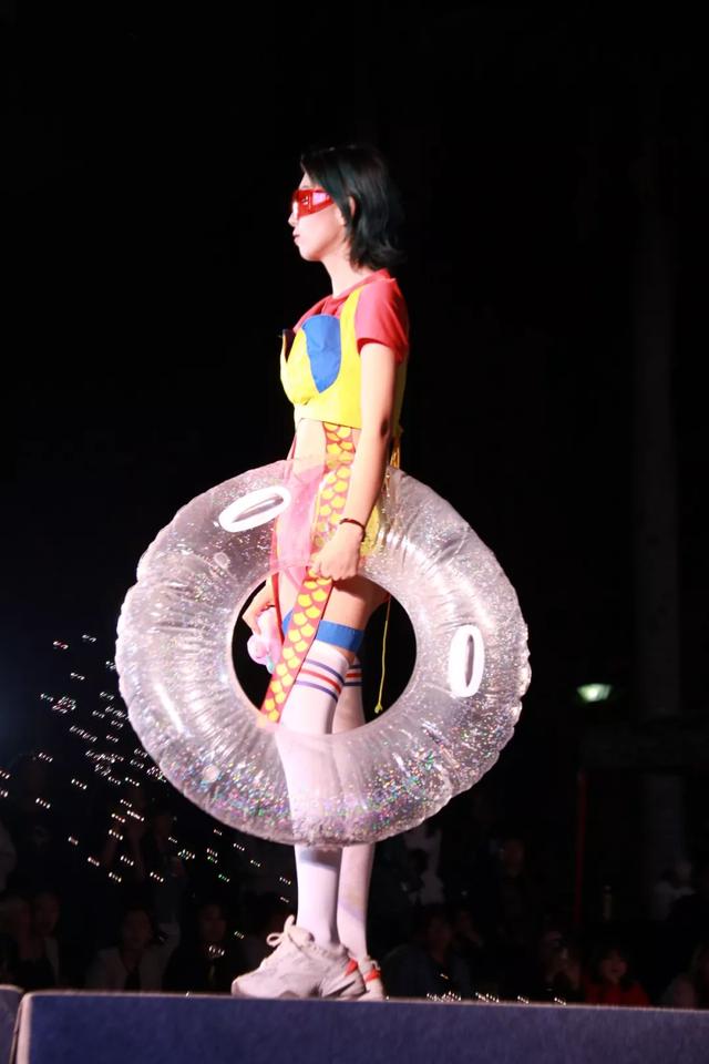 杨奕菲作品《Dragon Boat》以龙舟为主要设计灵感。将龙舟元素进行提取引用再融合设计,用联想、想象和比喻的创意方法来再诞生出新的造型效果,用拼接的方式将其呈现于服装之上。该作品将传统的中国龙舟文化元素与极限运动冲浪相结合,既兼顾了传统,又展现出了时尚的特征。
