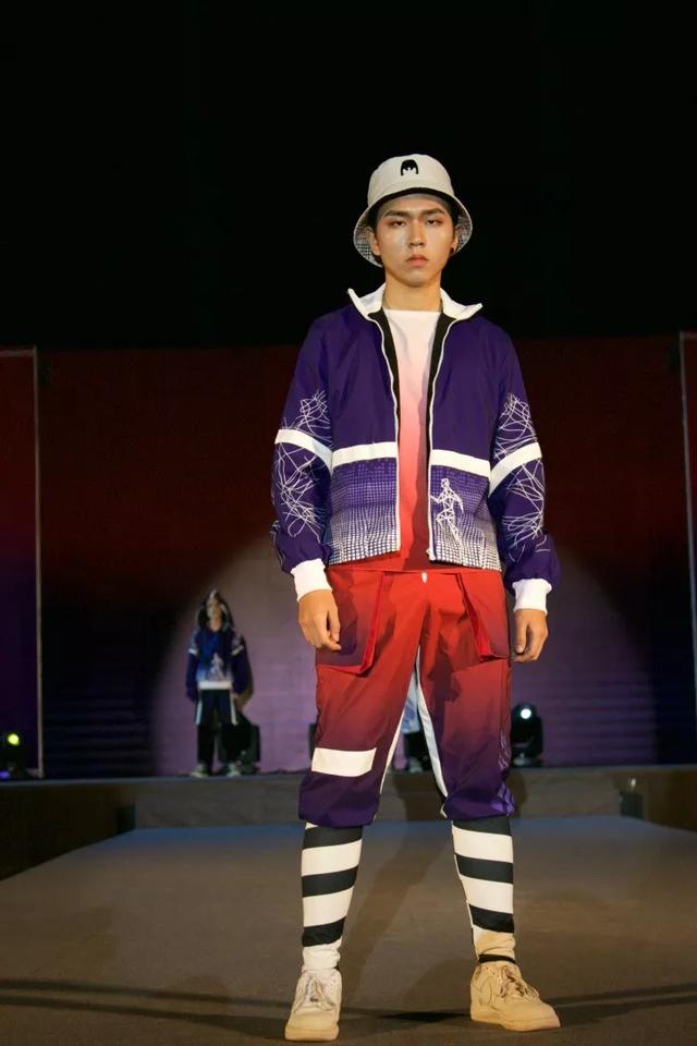 设计师裴森的作品为《侠道》,以中国古代“侠”文化为主要设计灵感,将传统的侠气韵味与当代的跑酷潮流风格相结合。采用渐变过渡的颜色配合宽松休闲的款式进行艺术化处理,并用印刷工艺将其呈现,使服装既具有侠义之风又方便运动,在符合当代大众审美的平时又巧妙地结合了传统文化。