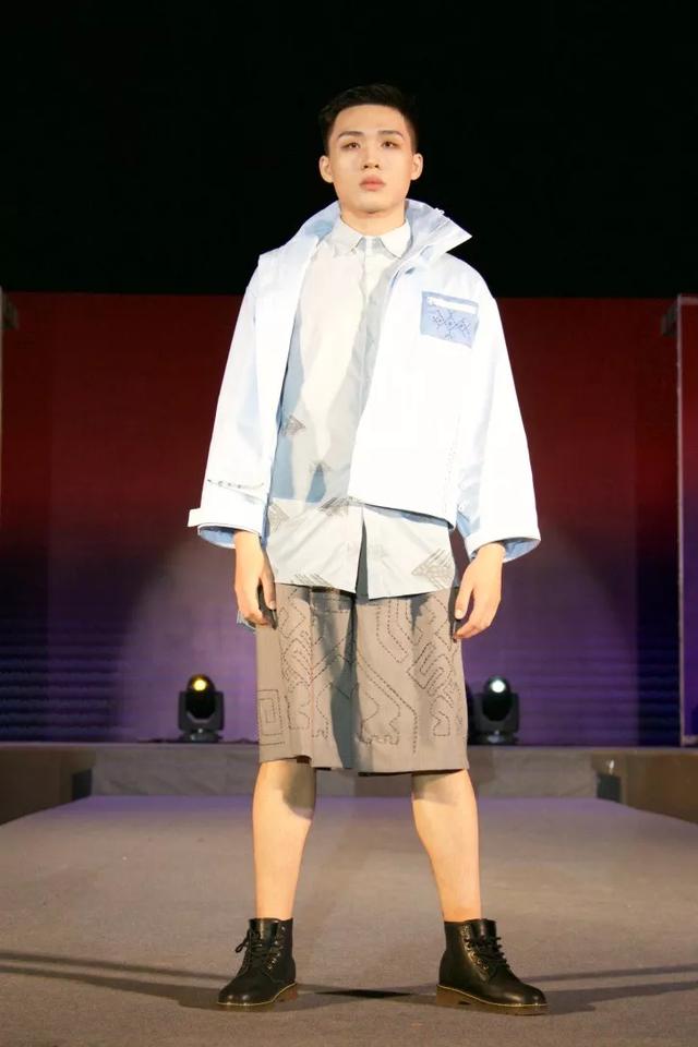 汤晓静的作品《新青年》汲取黎族动物纹样为灵感,经过打散重组,运用刺绣和印花工艺的手法将图案完美塑造。色彩上选取蓝白两种颜色进行搭配,面料以风衣料为主,搭配针织面料,整套系列服装简单干净利落,表现出当代年轻人的个性与风采。