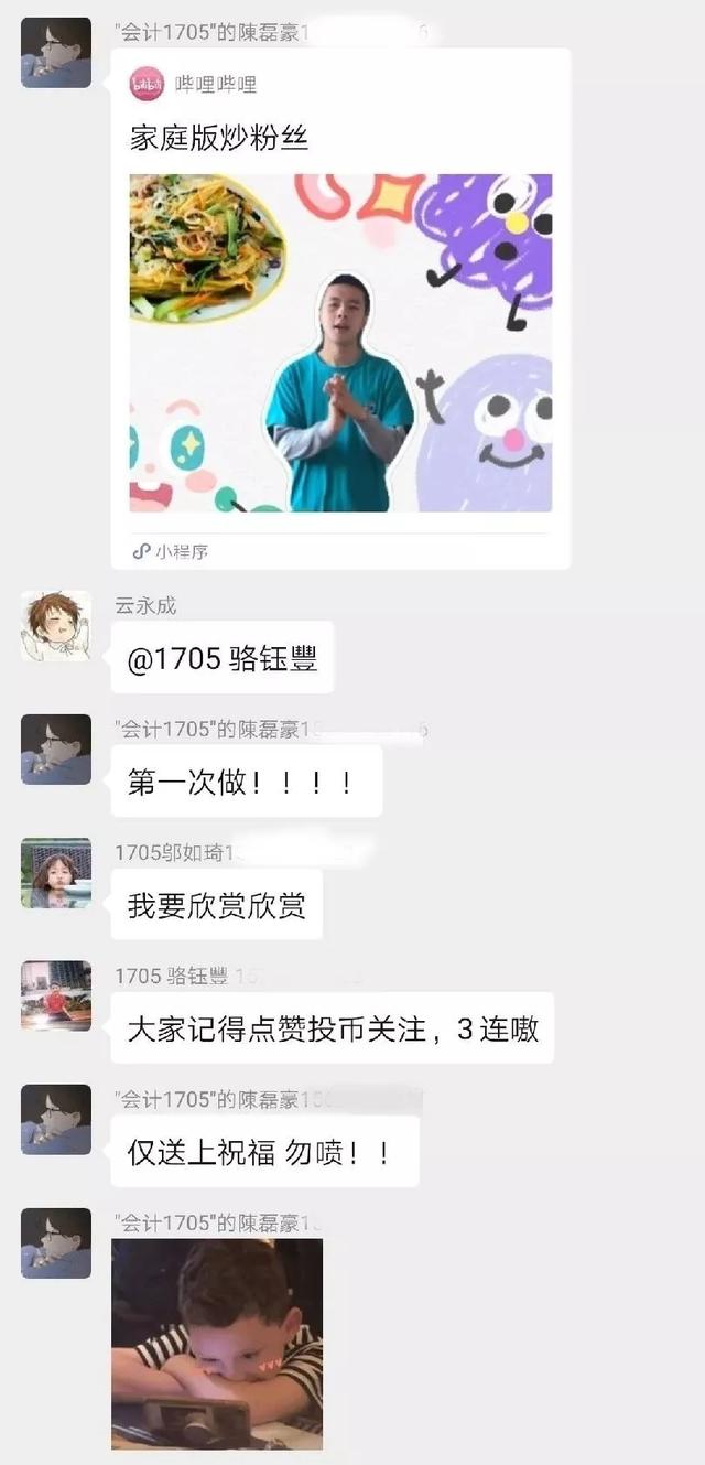 我们会计1703班是首次以微信平台来进行这次“元宵一家亲,抗疫一条心”主题班会,我觉得这次的元宵嘉年华形式非常新颖独特,同学们的参与度很高,每一个同学融入了进来。同学们的日常各有千秋,有的在学习厨艺打发无聊的时间,也有人在做手工,也有人在画画...希望以后有机会还能举办线上班会!