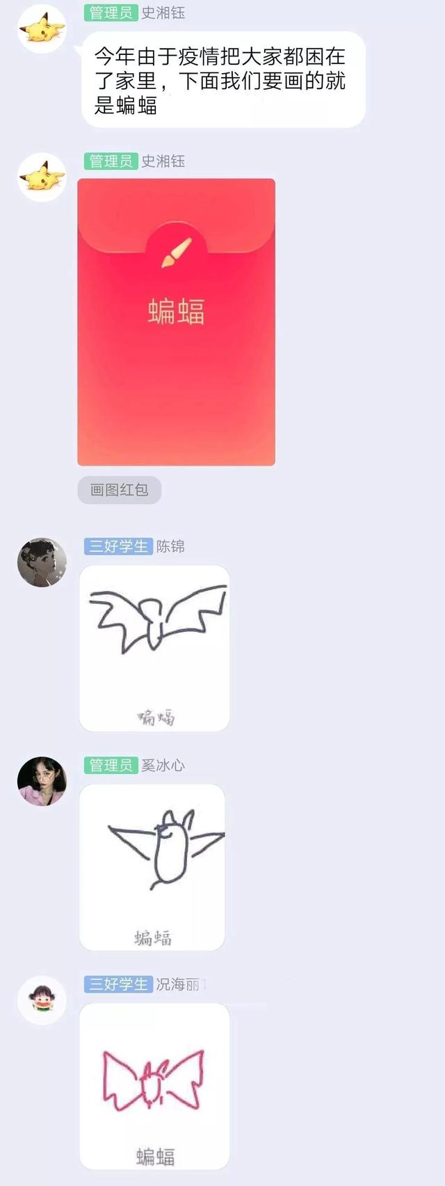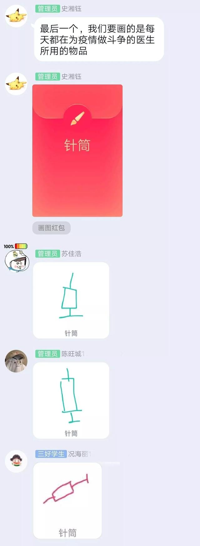 在这个环节不少班级还加入了元宵猜谜游戏、微信步数大比拼游戏,借助QQ群的红包功能加入了接龙红包、画图红包、家乡话祝福的语音红包游戏,腾讯被同学们“高超”的绘画技巧和“超高”的语言天赋打败,气氛热烈异常、红包雨不断。