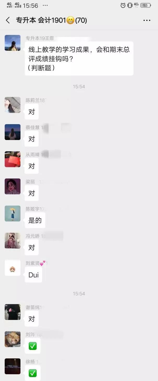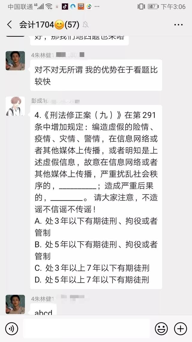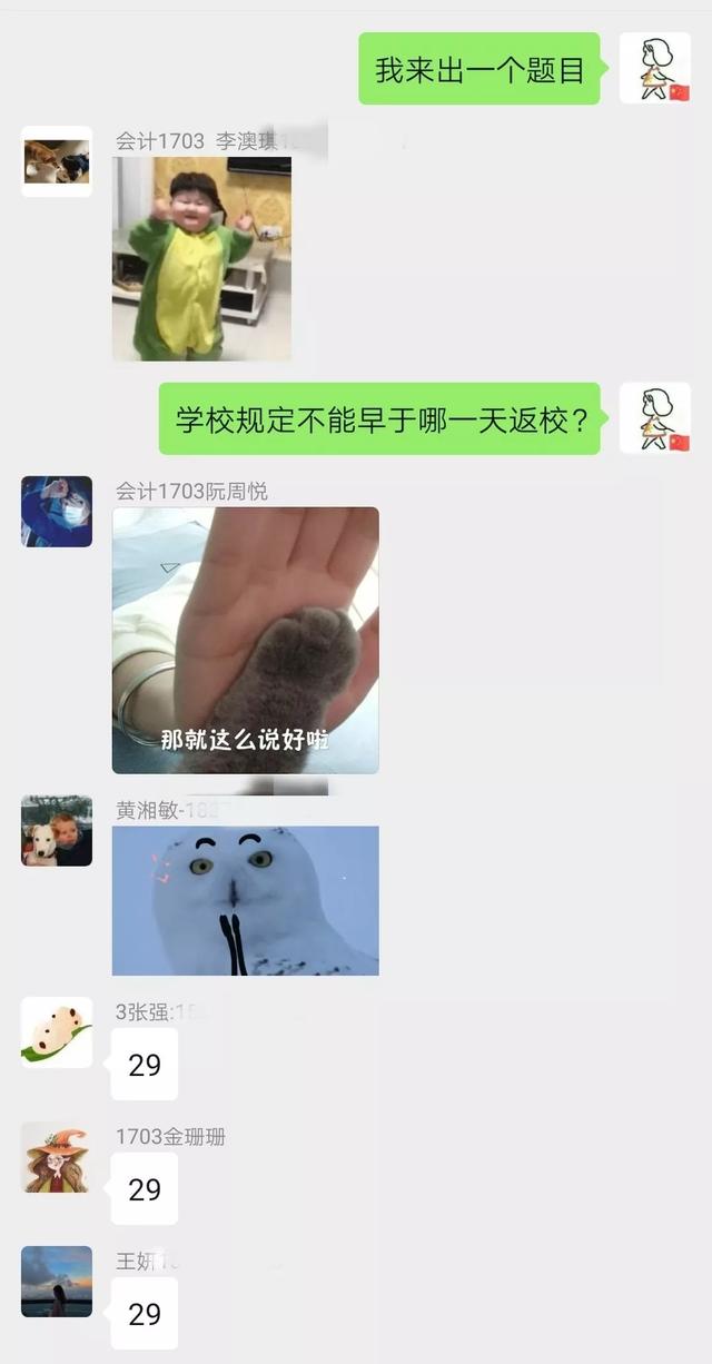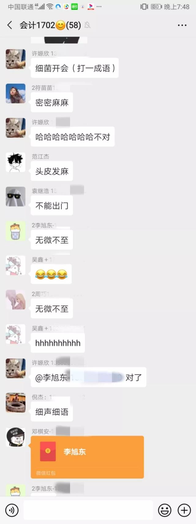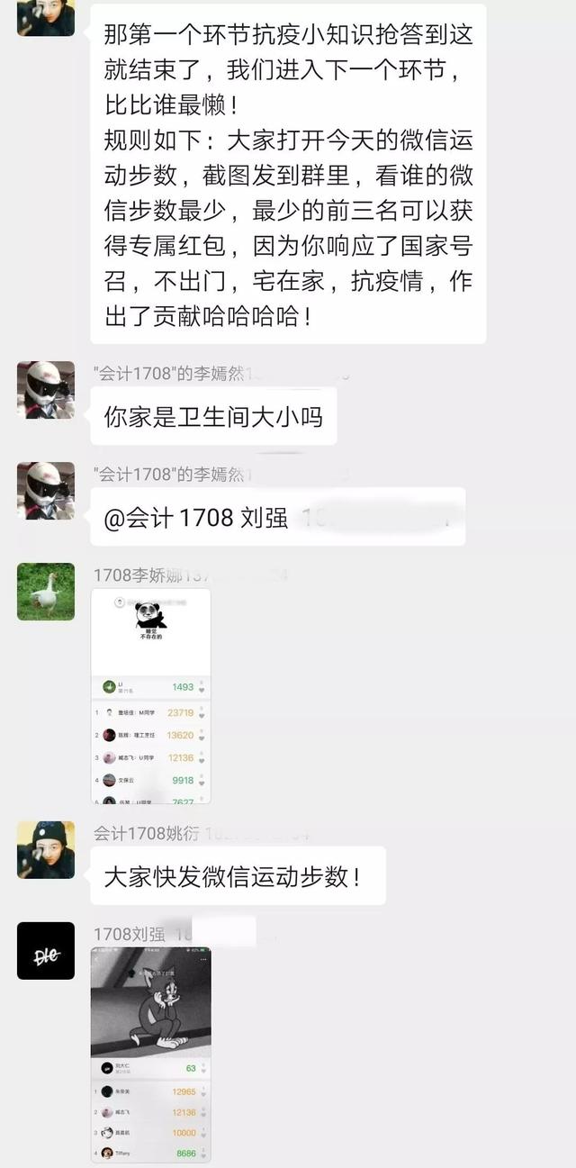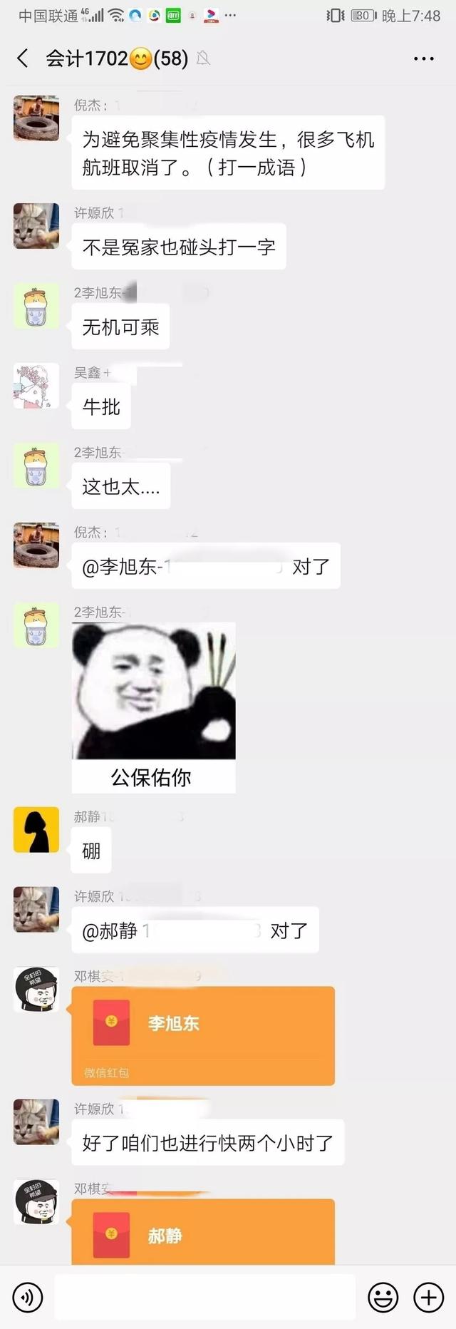 第一环节是抗疫知识抢答,答对的同学奖励红包。班委们根据权威专家们发布的可靠消息来自拟题目,题型多样,包括单选题、多选题、改错题、填空题、简答题;内容丰富,涉及“新冠”病毒的发病状况、传播途径、防护措施还有全国上下万众一心抗击疫情的重要举措等等,考察同学们对于这场席卷全国各地的疫情的了解程度。除此之外,该环节还考察了同学们对于学校工作的关注度,包括暂定什么时候开学,什么时候能够返校,延期开学线上教学安排等等问题在内,同学们都对答如流!从线上表现来看,参与度非常高,小编用几张截图带你一睹燃爆现场吧!