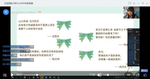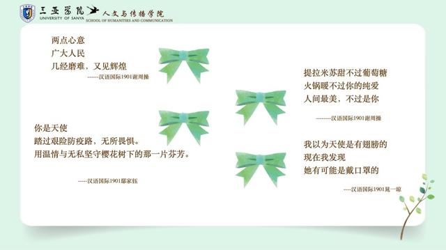 课后我思考如何调动同学们网课的积极性,在技术上有一定的局限性,不能及时监督同学们在上课时是否全身心投入,我选择调整教学方案、丰富教学内容来呈现。在第二堂课时,我调整了教学顺序,把第四章的诗歌写作提前,选择讲授“三行情书”写作。“三行情书”提升了同学们的参与度,弹幕互动明显增多,一些不常互动的学生也加入讨论之中,注意力的提升显而易见。为了检验学习效率,我在这次课后组织了一场“抗疫有情”的三行情书比赛,让全部同学以“抗疫”为主题,创作三行情书,在第三次课时择优选读。