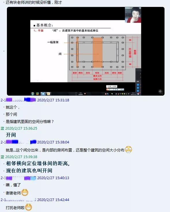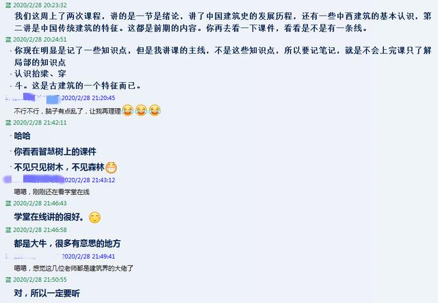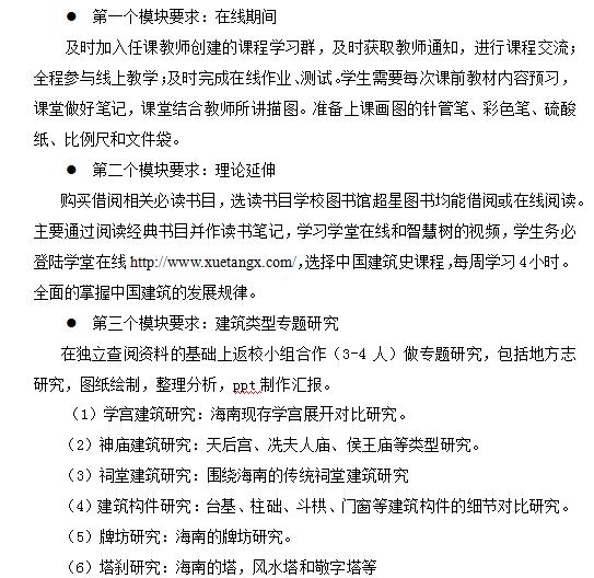 《中国建筑史》是国际设计学院环规系的专业核心课程,由陈琳和马永超两位教师教授。开课前夕,大家一起探讨选择什么样的学习平台,主讲教师也互动频繁,一起备战网课。随着对于平台的熟悉和教学指导计划的调整,最后确定了中国建筑史是用智慧树(视频学习、作业、问答、考试)+钉钉(直播)+QQ群(答疑、互动)。课堂组织安排,线上+线下结合。