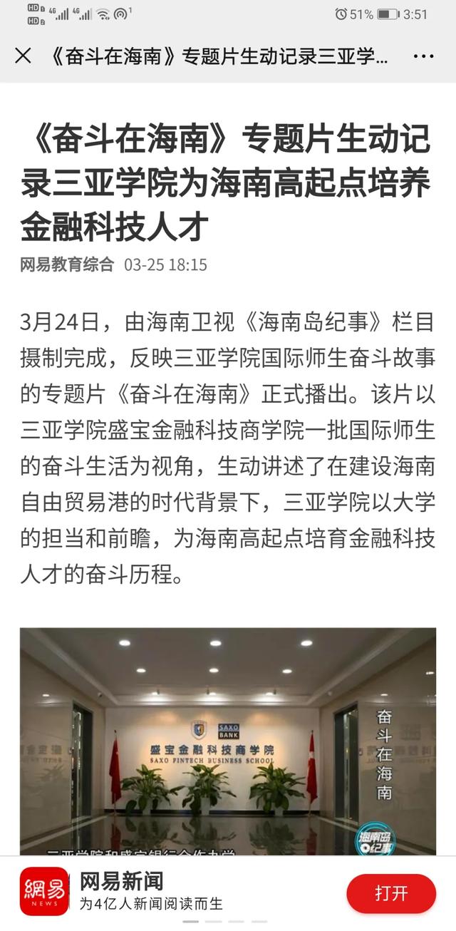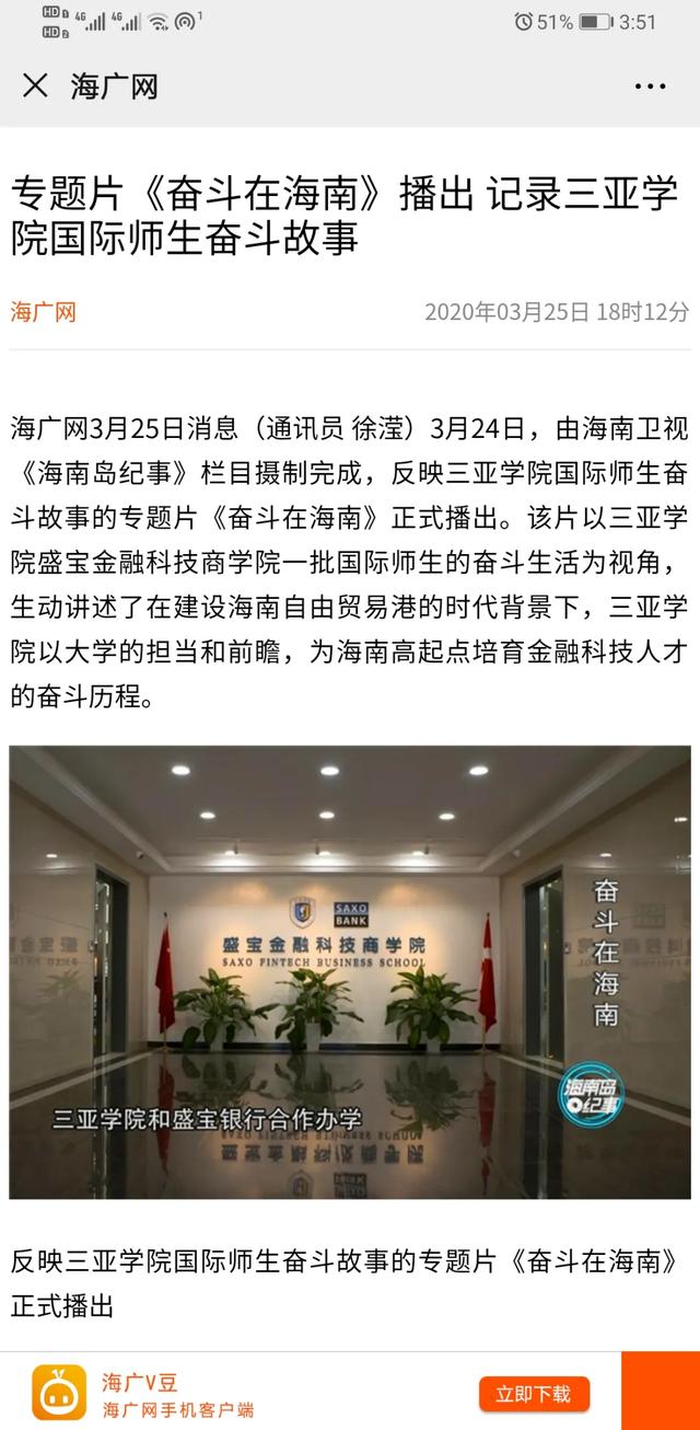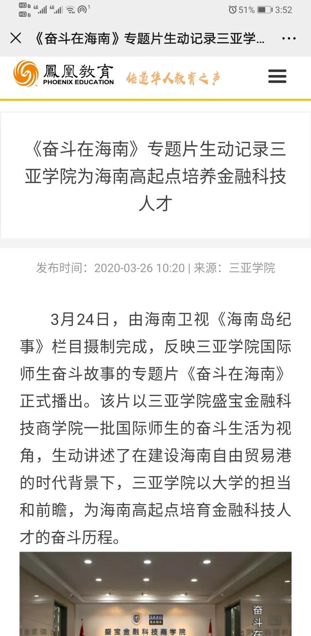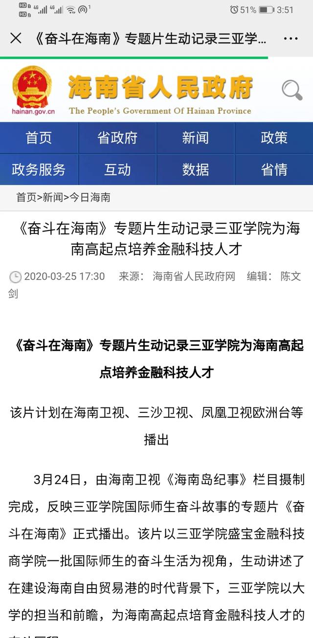 3月24日,由海南卫视《海南岛纪事》栏目摄制完成,反映2024澳门彩开奖结果查询国际师生奋斗故事的专题片《奋斗在海南》正式播出。该片以2024澳门彩开奖结果查询盛宝金融科技商学院一批国际师生的奋斗生活为视角,生动讲述了在建设海南自由贸易港的时代背景下,2024澳门彩开奖结果查询以大学的担当和前瞻,为海南高起点培育金融科技人才的奋斗历程。