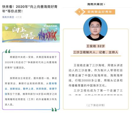 3月23日,根据团中央统一部署,共青团海南省委经过严格的审核和筛选,从全省129位好青年的推荐申请中最终确定了29名事迹突出者作为2020“向上向善海南好青年”,其中王俊皓荣获“爱岗敬业好青年称号”。