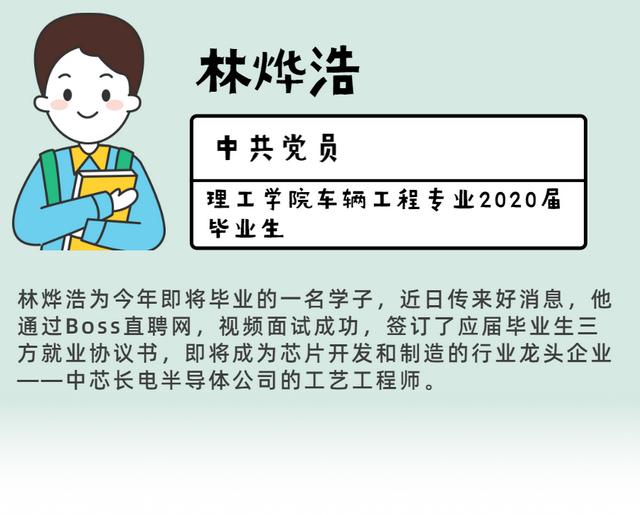 最后,林烨浩作为应届毕业生,祝愿所有2020届毕业生同学都能找到一份自己满意的工作,勇敢向前,融入这个新时代,并寄语低年级的学弟学妹,学好专业课知识,考取国家英语四、六级等级,尽量考取一些职业资格证书,在学习生活过程中,多提升表达能力、自信能力、沟通能力,争做社会浪潮里的弄潮儿。