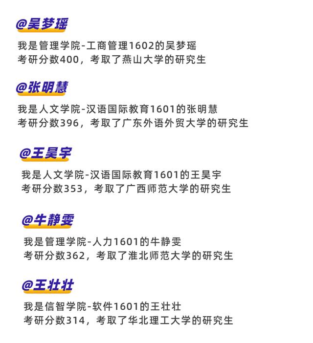 目前,我们已经收到了几十份各个学院发来的考研成功的学长学姐们的好消息,也还有更多处于“拟录取”状态的学长学姐在等待着确切的回音。近期,我们将邀请学长学姐们分享自己的经验和感悟,让考研上岸的学长学姐们带给你经验的同时,也把好运一同带给你。