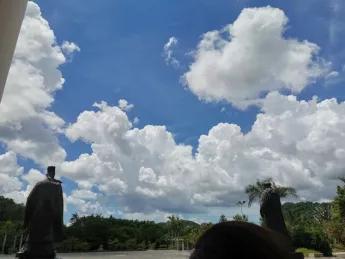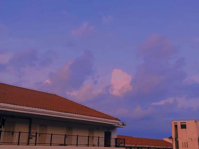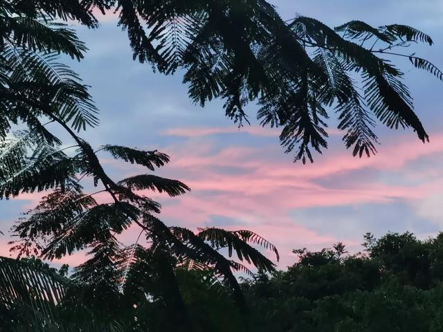 与我相隔甚远的亲人们,我要告诉你们,三亚很美,我在这边挺好的。蓝天白云是三亚最多的美景,我最爱的是那傍晚的红霞。日暮时分,云是迷糊的,渲染着几分浅浅的粉。若是与好友在学府大道上漫步,向西边看去,远有动人心魄的晕着浅红色流光的云漫在天边,近有青山绿水静默相称。总有几只孔雀在画面的正中间,或俯或立,虽不曾见它开屏,却总觉得这已然是极美的了,世间好似也再找不出更好。