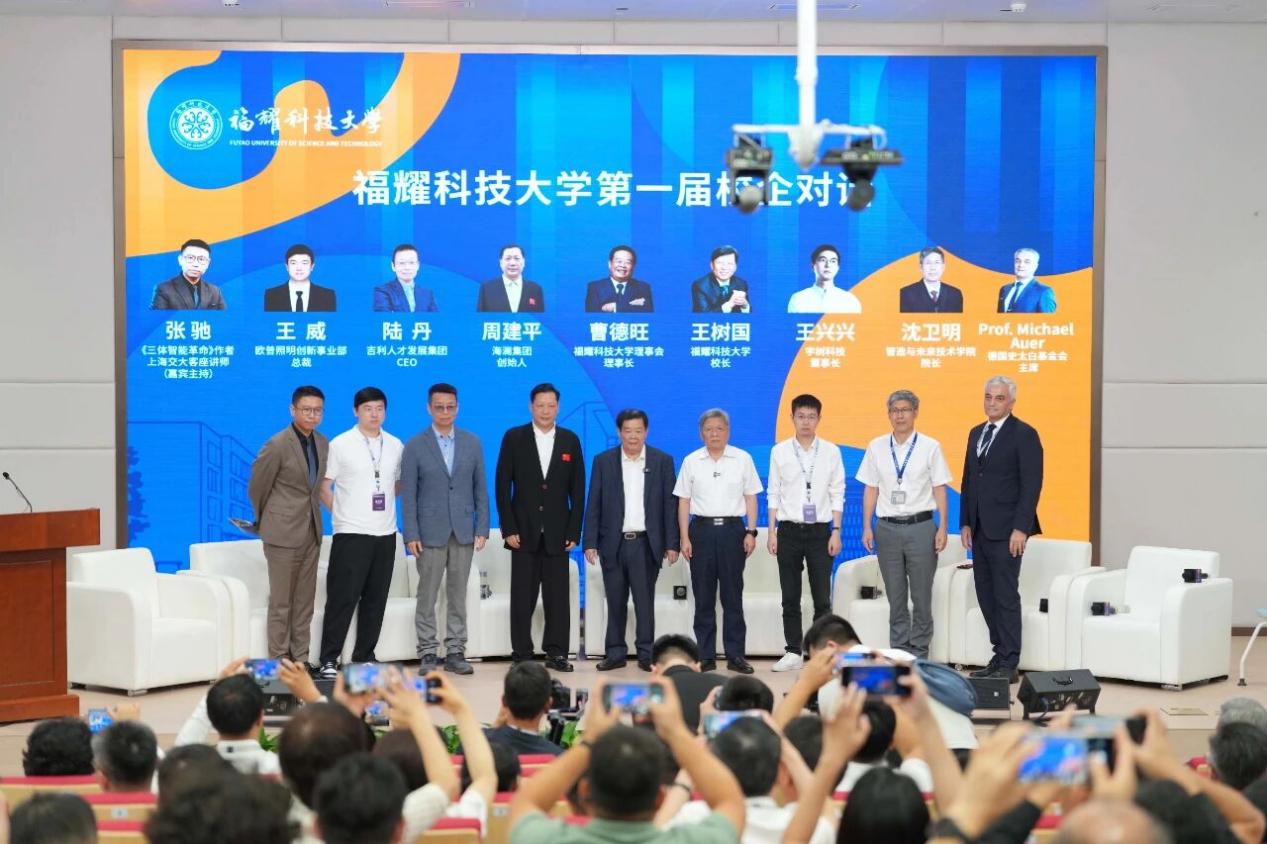 在校企对话环节,陆丹博士与福耀科技大学理事会理事长曹德旺、校长王树国、智造与未来技术学院院长沈卫明、宇树科技创始人王兴兴、海澜集团创始人周建平、欧普照明创新事业部王威等企业界、教育界人士,围绕“构建新时代校企合作新生态”主题,就校企合作模式、高校教学改革、企业需求对接等问题展开了深入讨论。