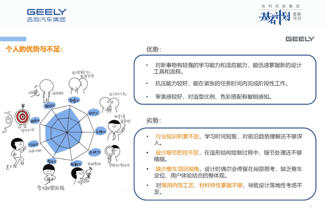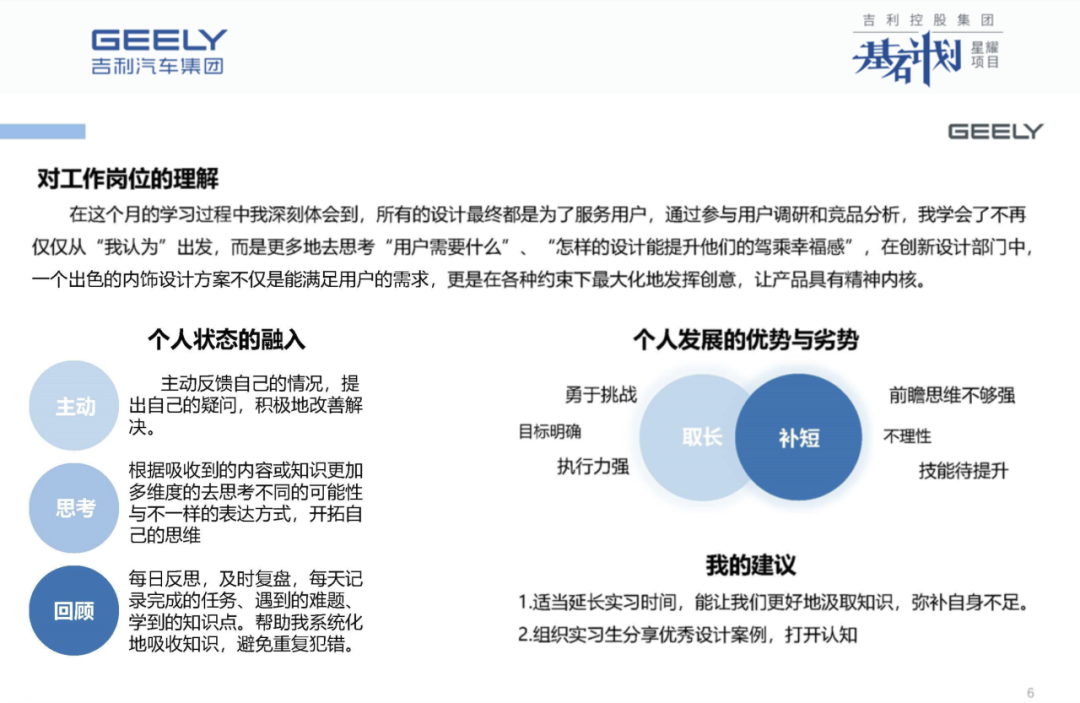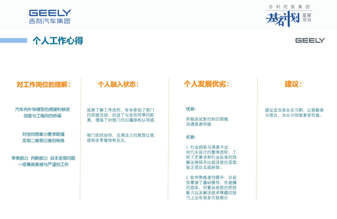 这次实习让我接触到真实项目,与一线设计师交流,深刻体会到设计是始于问题、忠于落地、将创意转化为产品的过程。我认识到自身不足,未来将继续深入学习,提升设计认知与技能,为成为一名合格汽车设计师并加入吉利不断努力。