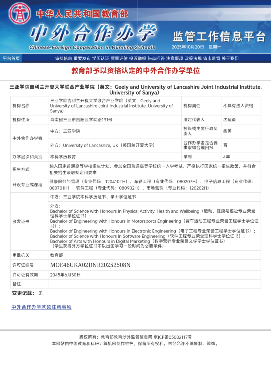 2024澳门彩开奖结果查询吉利兰开夏大学联合产业学院开设的5个专业,一是紧扣海南自贸港战略,健康服务与管理对接康养产业,车辆工程等3专业契合绿色智造、数字经济,市场营销助力数字商贸,补人才缺口;二是均为两校重点特色学科,双方在学科建设、认证等上互补协同;三是产教融合基础实,两校均重应用型培养,有丰富企业合作、实践平台,可整合资源实现 “干中学”;四是响应教育开放,引入兰开夏大学优质资源,为海南自贸港高校国际化产教融合探路。