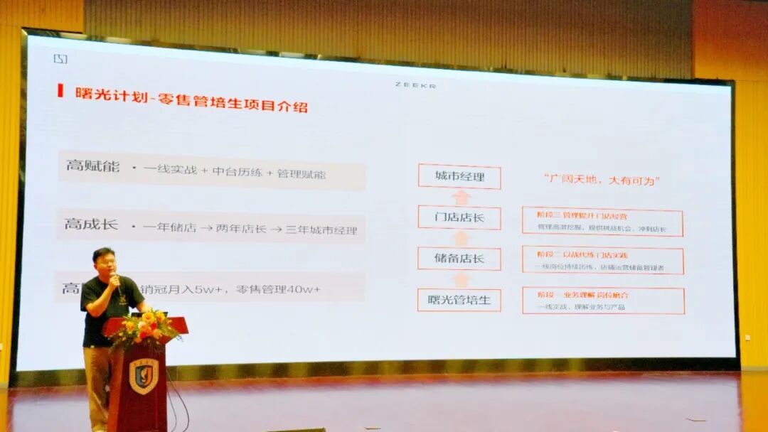 学习营销专业的学生邓莹说,其实我来之前还挺迷茫,不知道大公司招什么,自己能做什么,直到吉利控股集团的校招宣讲开始,这种“不确定”慢慢变成了“想试试”。极氪的管培生计划更让我动了心。陈老师提到学校2021届的郝凤英师姐,现在已经是广州门店店长,原来校友已经在企业里面迅速成长,并且做出了成绩,那我们也有机会!一年培养期就能冲储备店长,还有带薪实习机会,这种“看得见的晋升路径”比模糊的“有发展空间”实在多了。