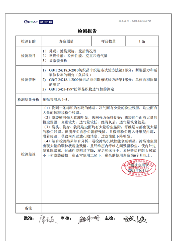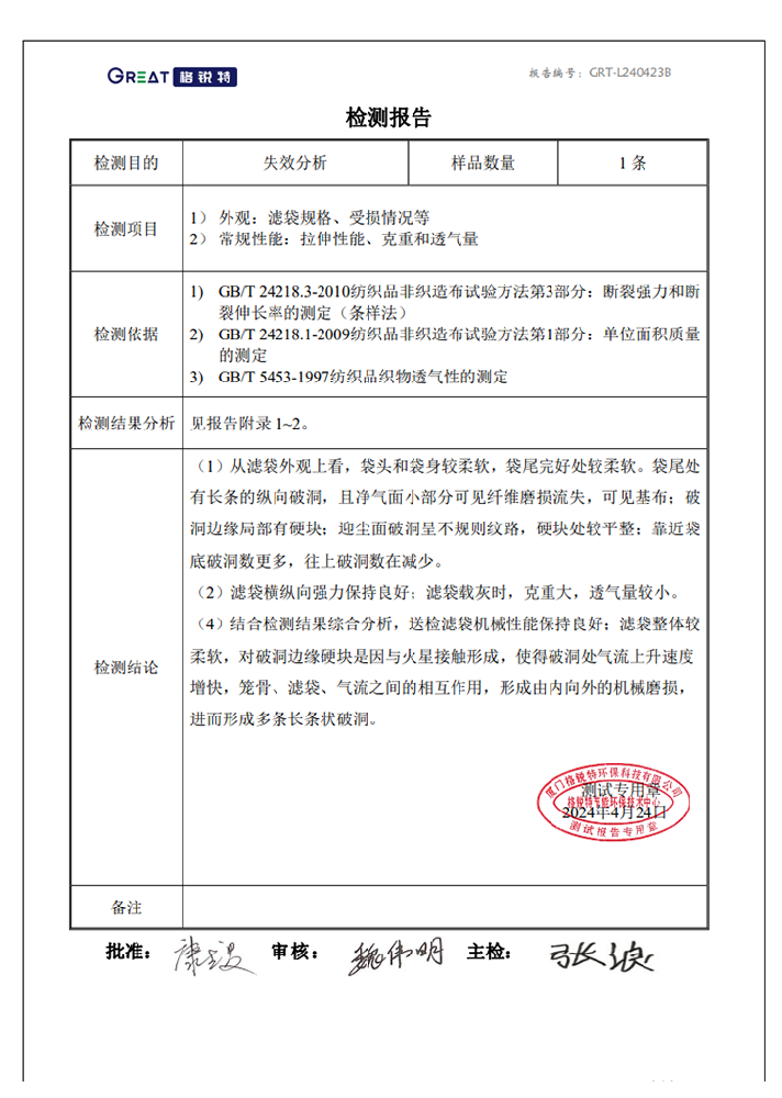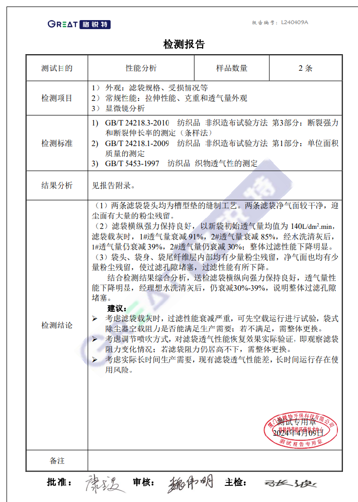 公司高度重视技术创新,检测中心可对滤料进行寿命预估、材质分析、失效分析、性能分析等,为客户选型提供依据并实时跟进滤料使用效果。